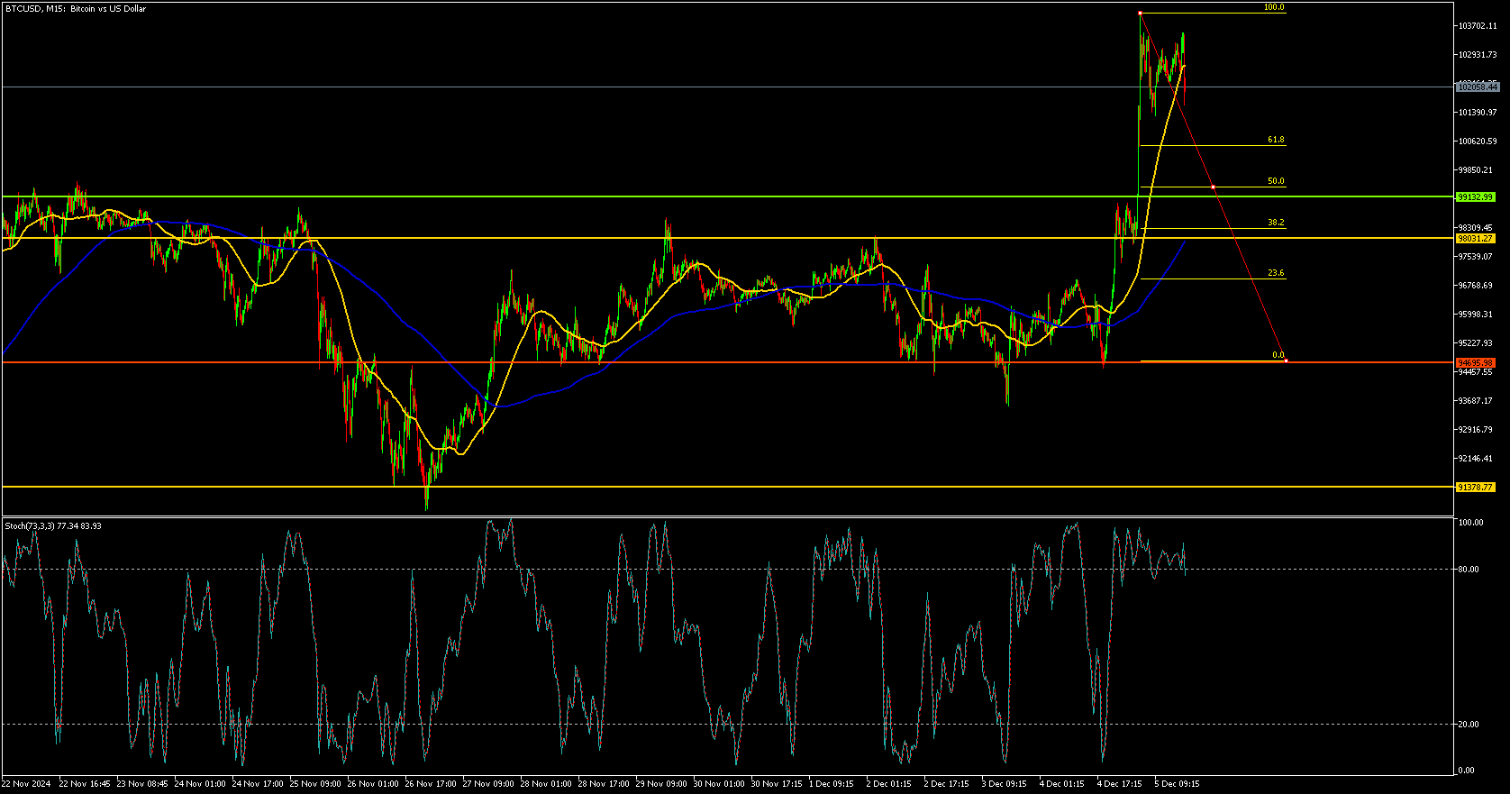 Bitcoin parece haber alcanzado un máximo local (100% de Fibonacci) alrededor de los $103,700 y está retrocediendo desde ese nivel.
